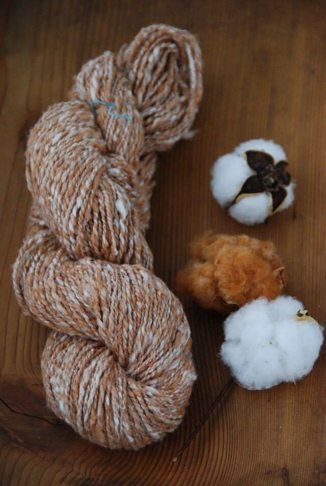 この糸は、洋綿と茶綿、2:1の比でミックスしました。