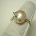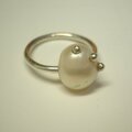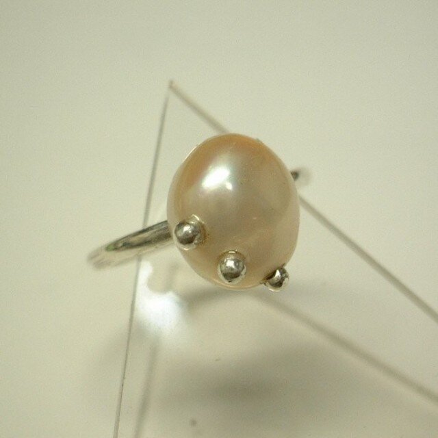 淡水パールを使ったリングです。 デザインは銀の丸線をパールの下側 三分の一に穴を開けて通しているシンプルなデザインです。 パールには銀に粒が3個付いています。この銀の粒によって宇宙っぽく見えたり、生き物に見えたり、不思議な感じに見えるデザインにしています。