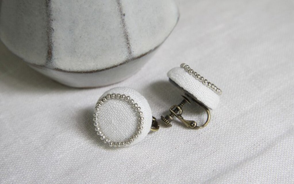 白のリネンに小さいサイズのボヘミアンビーズをラウンドに刺繍したイヤリング。