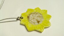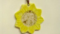 磁器(石の粉)で成形し、ひまわりの花を彫り、素焼き後、黄色と蕎麦釉を載せ、その上に透明な釉薬を掛けて本焼きしています。