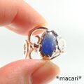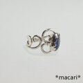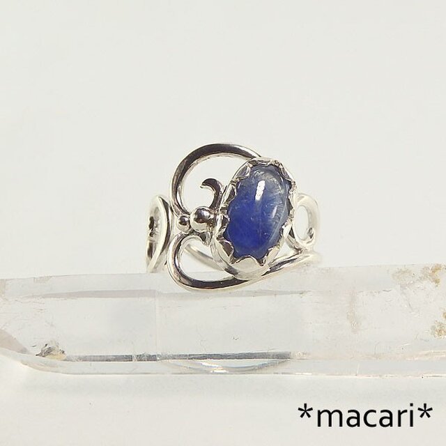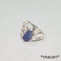 鮮やかなブルーのデュモルチェライトを内包した水晶のルースを少し変わったデザインの唐草リングに仕上げました。
