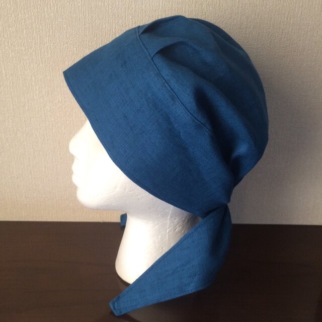 これまでに出品していましたリネンオレンジやインディゴよりも少し厚めのリネンキャンバス地ですので、全体の仕上がりもしっかりしています。生地は少し厚めですが、麻100%で頭頂部も裏地をつけずに一枚で仕上げていますので、これからの季節にも最適です。また、縫い代を表に出さない縫製でデリケートなお肌にも優しいデザインです。