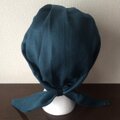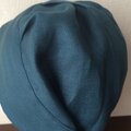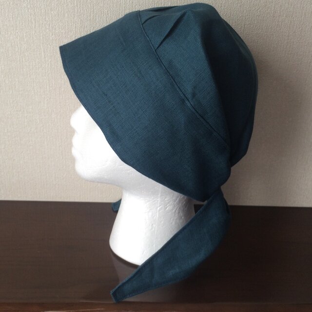 これまでに出品していましたリネンオレンジやインディゴよりも少し厚めのリネンキャンバス地ですので、全体の仕上がりもしっかりしています。生地は少し厚めですが、麻100%で頭頂部も裏地をつけずに一枚で仕上げていますので、これからの季節にも最適です。また、縫い代を表に出さない縫製でデリケートなお肌にも優しいデザインです。