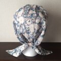 薄手の綿100%…グレーのボイル地に白い花柄、優しい雰囲気のキャップです。肌ざわりも爽やか、柔らかい生地なので気軽に被っていただけます。