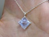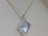透明度抜群の淡い水色*イリノイ産フローライト八面体のシンプルなシルバーペンダント*フローライトは劈開方向がハッキリしているため金具差し込みでは力が加わった際に割れてしまう可能性が高く透明度が高いほどその加工痕も見えてしまうのでそれぞれに合わせた石枠を作っております*八面体ですのでコロンコロンと45度左右に向きます*黒化遅延の樹脂コートを施してあります*925チェーン太さ1.3㎜長さ40㎝*長さのご要望がございましたら承ります*
