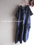 【受注製作/6.18再販売】W45半袖リネン前ヒモリボンフード付きワンピース★インディゴ
