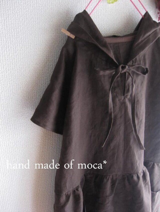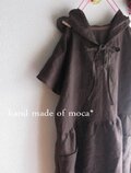 【受注製作/10.5再販売】W45半袖リネン前リボンフード付きワンピース★濃茶