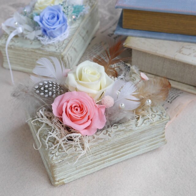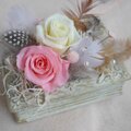 陶器の洋書の花器にピンクとホワイトのバラ、さまざまなフェザーでふわふわしたリングピローを作りました。わらのようなスパニッシュモスを敷き、小鳥の巣の中にピンクとホワイトのバラが咲くイメージです。