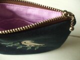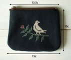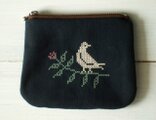濃い青緑のハーフリネン生地にクロスステッチの鳥刺繍をしたミニポーチです。