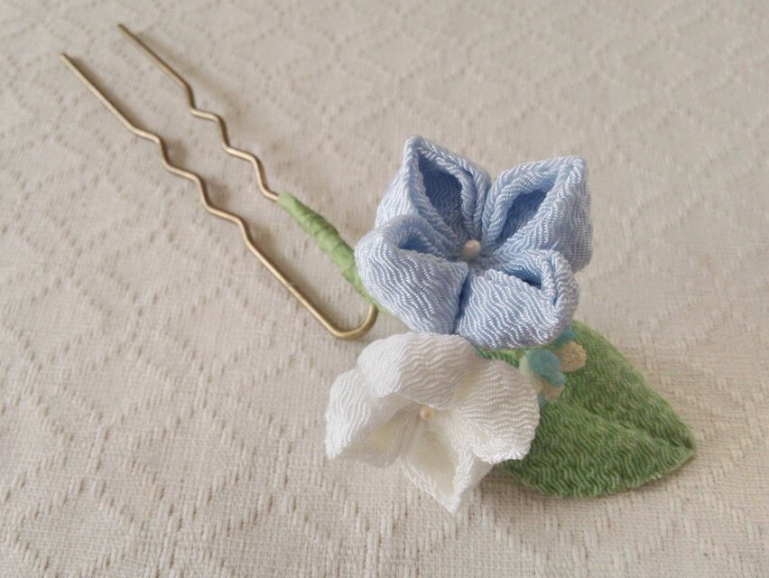 ちりめんで制作したつまみ細工の紫陽花のかんざしです、