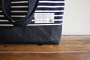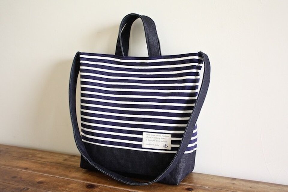 紺☓白ボーダーニットにインディゴデニムを合わせて、2wayショルダーバッグを作りました。