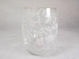 ガラスのころんとしたグラスに手描きました。全体に白でふんわり世界を作り、のばらのお花を手描きしました。お花は部分的にほんのりピンクです。底には優しいピンクをいれてさらにラブリーにしあげました。・・^^いかがでしょうか?