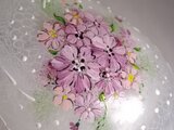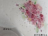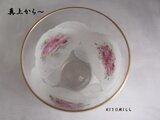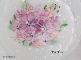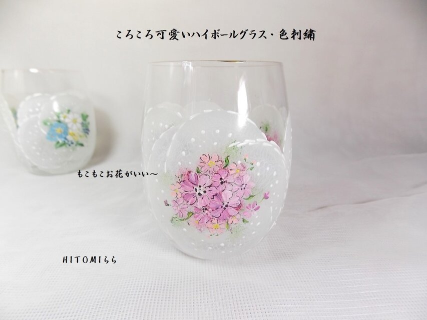 ガラスのころんとしたグラスに手描きました。全体に白でふんわり世界を作り、刺繍のように一杯のお花を手描きいたしました。お花はもこもこ感に描きレース模様をいれて仕上げました、ふちに金彩をいれています。かわいい感じです・・^^