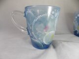 ガラスのマグカップに宇宙的な世界をさらに増やして描き、お花とドットで星座を手描きいたしました火の星座。(お羊座、しし座・いて座)を描いています。グラスの下部分に青色を入れてさらに宇宙的に~。星座は金彩しています。凹凸は手で持ってもいい~かんじです。