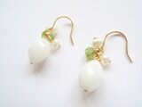 カットの入ったホワイトクォーツ、淡水パール、ペリドットを使ったピアスです。