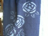 明るい藍色の地に絣ならではの青と白のトーンの丸いかわいい薔薇が並んだ前身ごろに