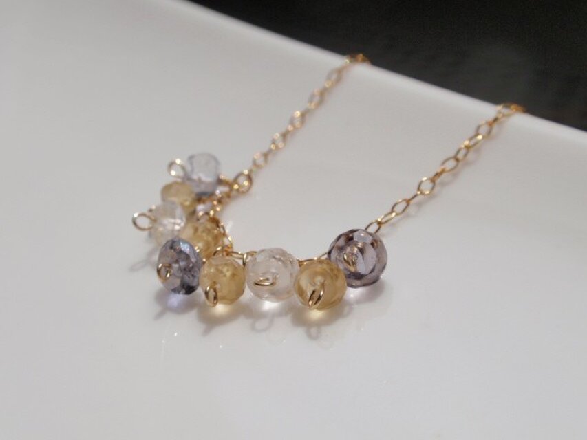 アイオライト・シトリン・ホワイトトパーズの粒寄せネックレスです。