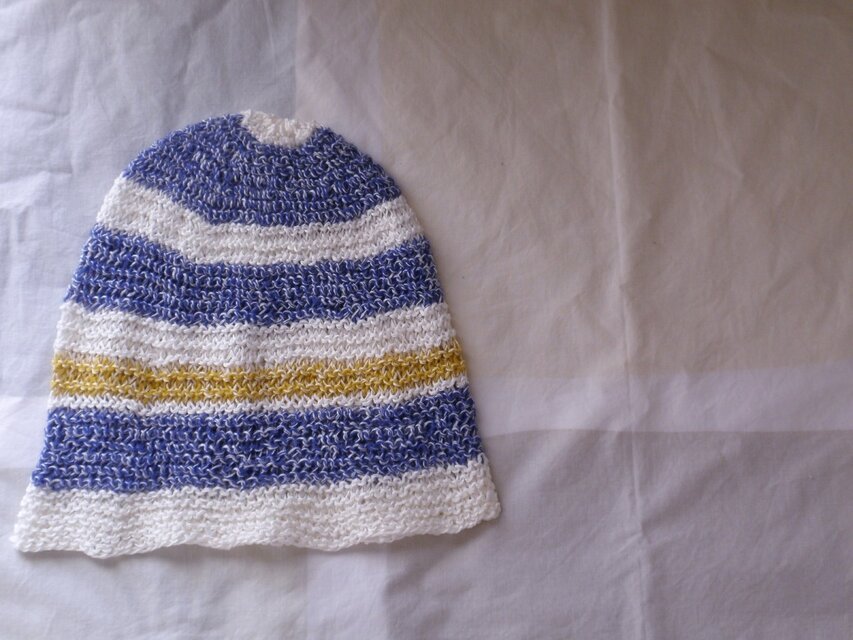 リネン100%の白糸をベースに、綿と麻半々の糸でボーダーに編んだニットキャップです。