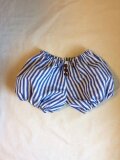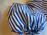 C&Sさんのハーフリネンストライプで作った1枚仕立てのバルーンパンツです。パリッとした質感の布で、さわやかなブルーのストライプがこれからの季節にぴったりです。