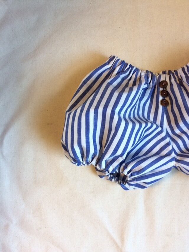 生地量をたっぷりと使い、コロンとしたかわいい形になっています。サイドを少しすっきりさせたかぼちゃパンツもありますので、あわせてご覧ください。