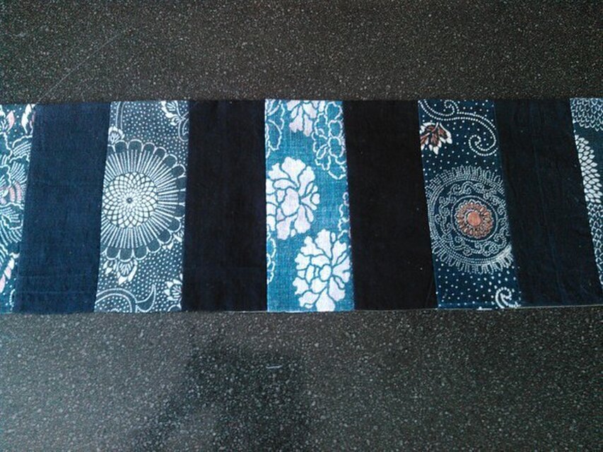 表地は藍の型染めを8枚と藍の無地9枚をつなぎました。