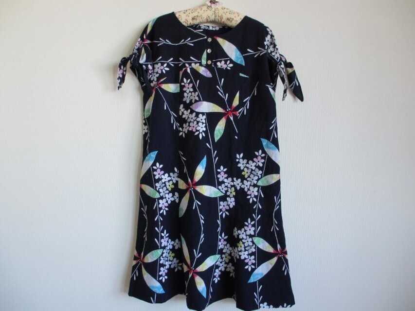浴衣のリメイクです。浴衣地ならではの、適度な張りがありますので、体型をカバーし、布をたっぷり使用していますので、ゆったり涼しく着用できます。
