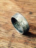 明治39年から明治44年(1906〜1911年)に発行されていた旭日20銭銀貨を加工して作ったコインリングです。