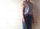 グレー色Tシャツの袖をシルクの花柄ヴィンテージスカーフでバタフライスリーブにつけかえ
