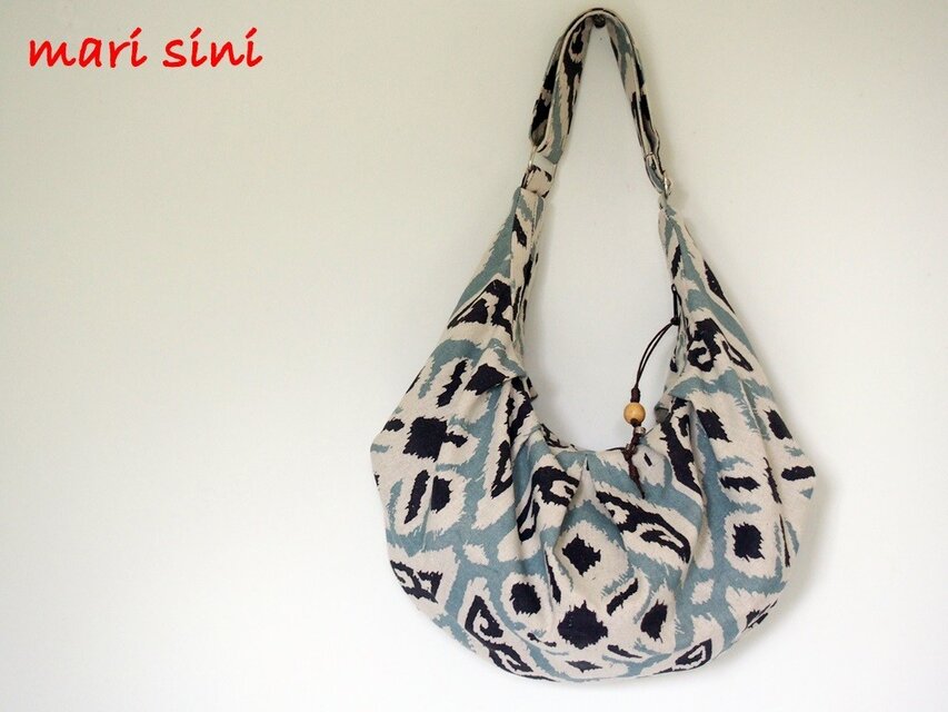 ナチュラル地にイカット(絣織り)風のサックス×ブラックのプリントで、大胆な柄ですが優しい色合いなので、どんなスタイルにも合わせやすいと思います。