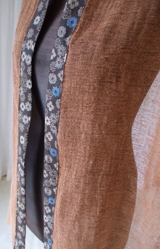 薄くて軽い上質の泥大島と麻の蚊帳を柿渋で3度染めました。使い込んでいくとやわらかくなっていきます。蚊帳はひとはばそのまま使っています。片側は耳です。傷みはありません。