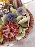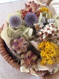 プリザーブドフラワーのダリアやドライフラワーのアジサイをメインにたくさんの種類の小花や実物を使用しました。