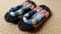 鼻緒がきつかったり、緩んだら布ぞうりの裏で鼻緒を結びなおしてください。