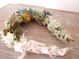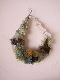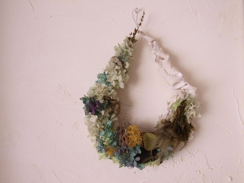 草原の葉に落ちた雨の雫に、周りの風景が映っているようなイメージで作った雫のリースです。