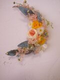グラデーションの美しいオールドローズやマム、アジサイなどで作った三日月形のリースです。さわやかなオレンジ色の組み合わせで明るく輝くお月様をイメージしてみました。
