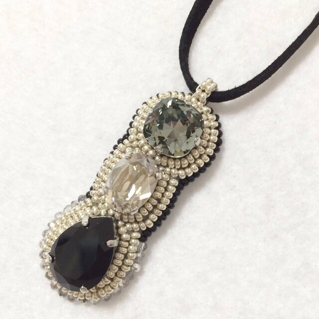 縦に並んだスワロフスキーは、上から「ブラックダイヤ」「クリスタルシルバーナイト」「ジェット」。シンプルなデザインでスッキリとしたシルエットが特徴です。お出かけからパーティーまで幅広くお使い頂けるペンダントです。