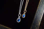 光の角度によって虹色やきれいなブルーの光を放つロイヤルブルームーンストーンを繊細なミル打ちを施した枠でお留めした小さなネックレス。