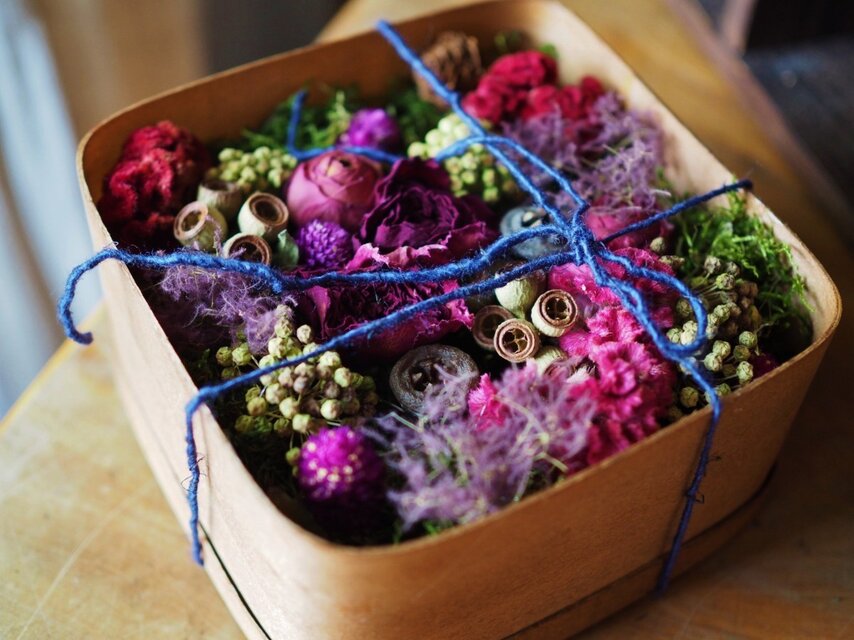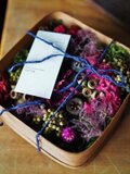 木の皮で作られたBOXに小さな木の実とドライフラワーで