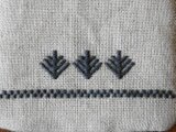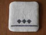 織り目の細かいリネン生地に、 「 松笠 」 と 「 市松 」 を刺したコースターです。