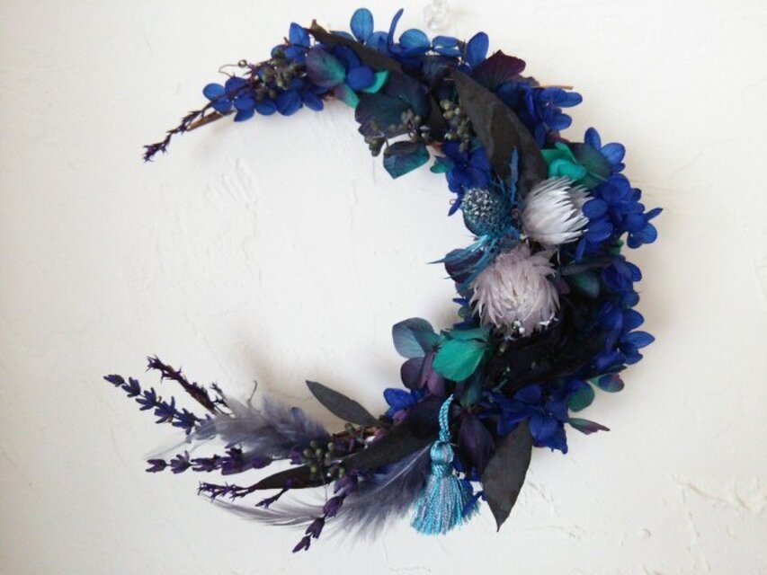 プリザーブドフラワーのアジサイ、ユーカリなどで作った三日月形のリースです。