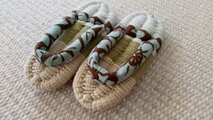 鼻緒がきつかったり、緩んだら布ぞうりの裏で鼻緒を結びなおしてください。