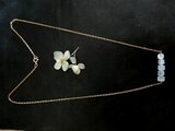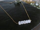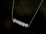 ネックレスは、5石をストレートにつないでシンプルに。ある程度石の大きさがあるので、胸元で存在感があり、どんな服にも似合うと思います。胸元で揺れると角度によって青や虹色の輝きが美しいネックレスです。