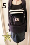①エルゴカバー…腰ベルトとママのお腹の間にカバーのふたの部分を下から差し込んではさみ、下の部分をゴムで縮めて袋状にしておきます。