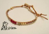 赤の細い革紐に、ゴールドとつや消しの赤いチェコビーズが配色されて