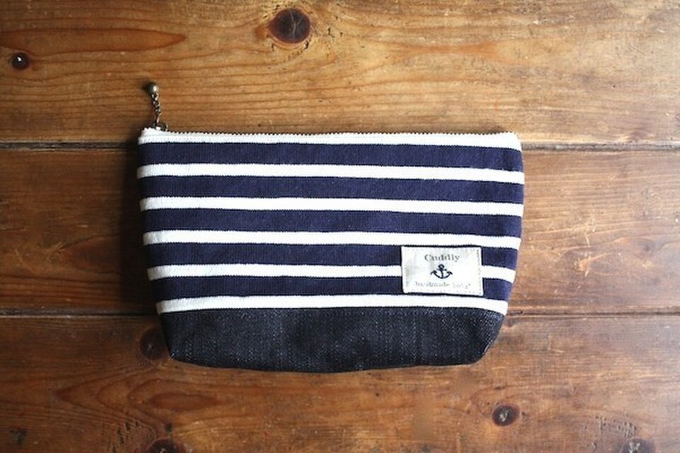 紺☓白ボーダーニットにインディゴデニムを合わせてポーチを作りました。