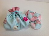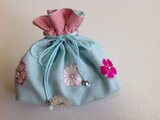 古いシルクの夏帯で作った、お手玉5つと巾着袋のセットです。巾着袋の帯地には手刺繍が施してあり、刺繍の真ん中には小さなビジューをつけました。