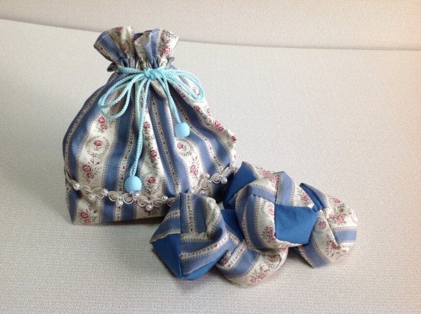共布で作ったお手玉5つと巾着袋のセットです。巾着袋にはパールをあしらいました。