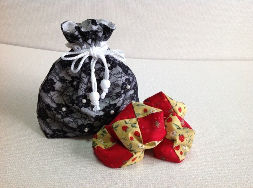 コットンの生地で作ったお手玉5つと、黒のレース地と白のラメ入りオーガンジーを重ねた巾着袋のセットです。巾着袋にはパールをあしらいました。