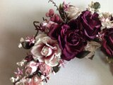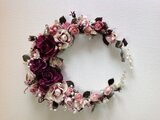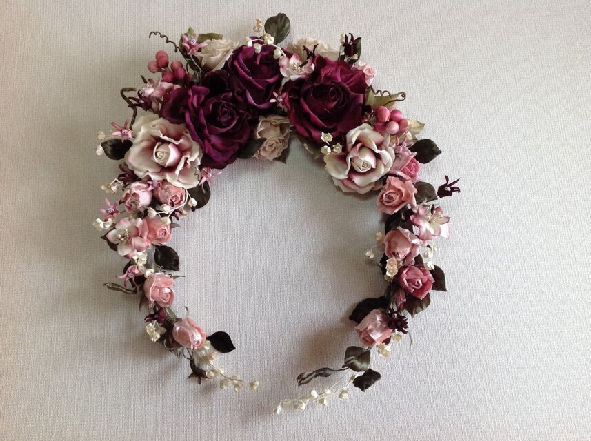 ビロードで作った濃いワインレッドのバラは、深みを帯びた色合いで、アンティークな雰囲気が漂います。小ぶりの薄いピンクのバラも、毛足があり艶のある生地です。