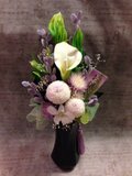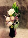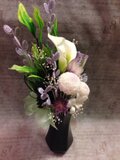 ブラックの縦長の花器に紫系のお花でというオーダーでしたので、アートフラワーのカラー以外は全てプリザーブドフラワーを使い、紫系でまとめてみました。赤紫のタッセルがポイントです。