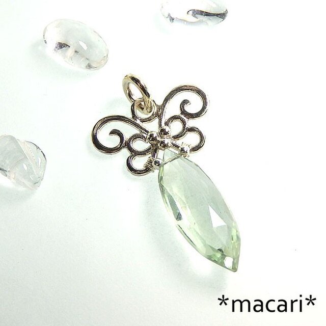 蝶の羽のような唐草ラインのモチーフにグリーンアメシストを飾り付けた